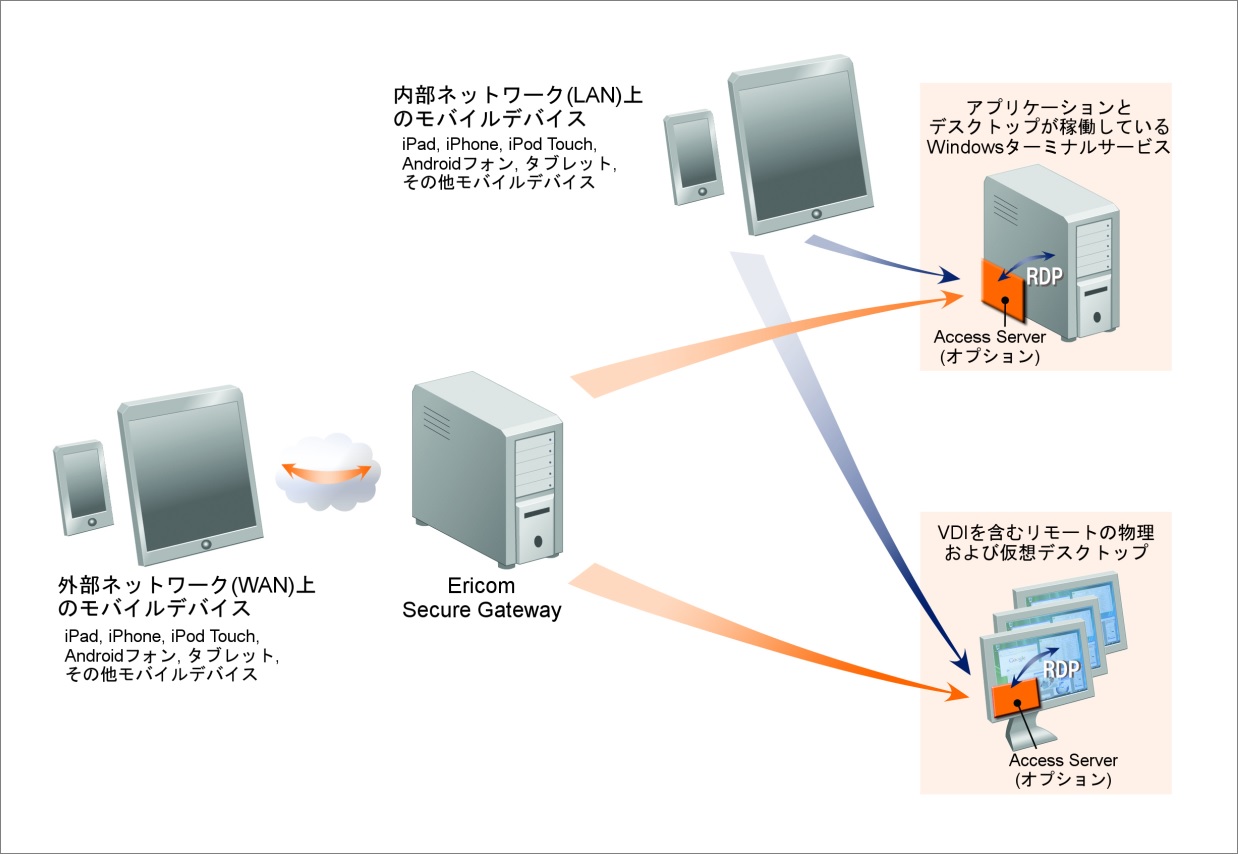 Ericom AccessToGo は、対応する携帯電話やタブレット・デバイスから Windows デスクトップやアプリケーションにリモート接続する機能をエンドユーザに提供します。