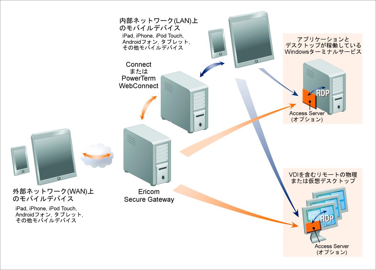 この図は、AccessToGo の各コンポーネントと Ericom Connect または PowerTerm WebConnect ブローカーがどのように連動するかを示しています。 オレンジ色の矢印はリモート接続を示し、青色の矢印は内部接続を表しています。