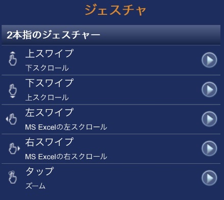 以下の画像は、デフォルトのジェスチャの設定を示しています。