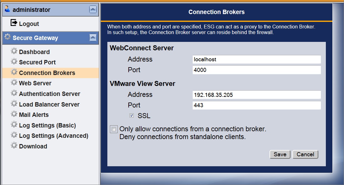 コネクション・ブローカーを介した接続のみを許可するには、Deny connections from Standalone clients を選択します。スタンドアロンの Blaze および AccessNow クライアントを介した接続試行は拒否され、管理されたブローカーを介した認証がすべてのユーザに必要とされます。