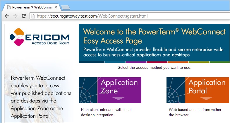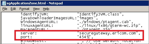 この例では、PowerTerm WebConnect サービスに接続するために、sgapplicationzone.html により 外部 Secure Gateway アドレスがポート 4545 上で指されています(securegateway.ericom.com:4545) 。