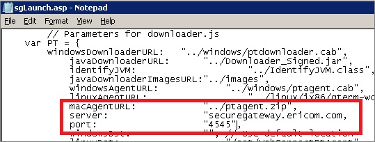 デフォルトでは、URLのアドレスとポートが sgLaunch.asp に使用されます。ほとんどの場合、このページをカスタマイズする必要はありません。 sgapplicationzone.html と同様に、ハードコートした値を「server:」と「port」の変数に設定することができます。