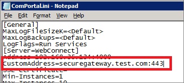 以下の例では、PowerTerm WebConnect サービスにアクセスするために、Secure Gateway をポイントするよう Comportal.INI を設定しています。