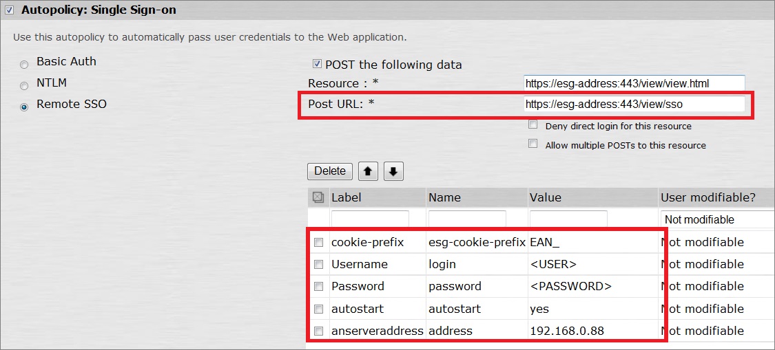 値「esg-cookie-prefix」により、フォームの AccessNow Cookie のプレフィックスが定義されます。これは、AccessNow の接続のための必須項目です。 ターゲットが相対 URL の場合、パスの「/sso」の部分が置き換えられます。ターゲットが完全な URL の場合、現在のパスが完全に置き換えられます。