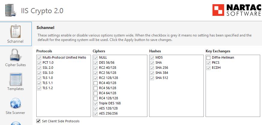 Ericom Secure Gateway は、「SSL Medium Strength Cipher Suites Supported」へのセキュリティ保護対策が施されたオペレーティング・システムに対応しています。 この脆弱性に対する保護の基本的なステップは、すべての下位ビット暗号(RC2 および RC4)を無効化することです。これは Nartac の IISCrypto を使用して実行できます。 例えば、 Nartac の IISCrypto を使用して、以下を設定した後にオペレーティング・システムを再起動します。