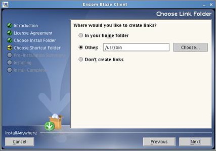 インストール・ディレクトリには、blazeという名前の実行可能ファイルが含まれています。Ericom Blaze クライアントを起動するには、このファイルを実行します。 グラフィカル・インストーラでは、実行可能ファイルへのリンク・ファイルを希望するディレクトリ内に作成するオプションが提供されます。デフォルトは、/usr/binです。