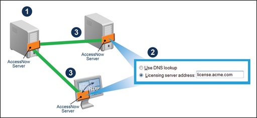 - ステップ 3: Access Server のサービス起動後、Ericom AccessNow または Blaze の セッションが確立されます。その際、事前設定された セントラル・ライセンス・サーバに接続します、ライセンスを取得します。