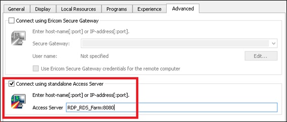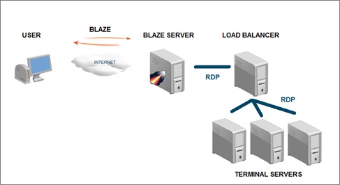 Access Server のアドレスに接続するように Ericom Blaze クライアントを設定します。 Access Server により、ロード・バランサへの通信が転送されます。 良好なパフォーマンスを確保するため、Access Server、ロード・バランサ、RDP ホストを近接させ、レイテンシを最小限にする必要があります。
