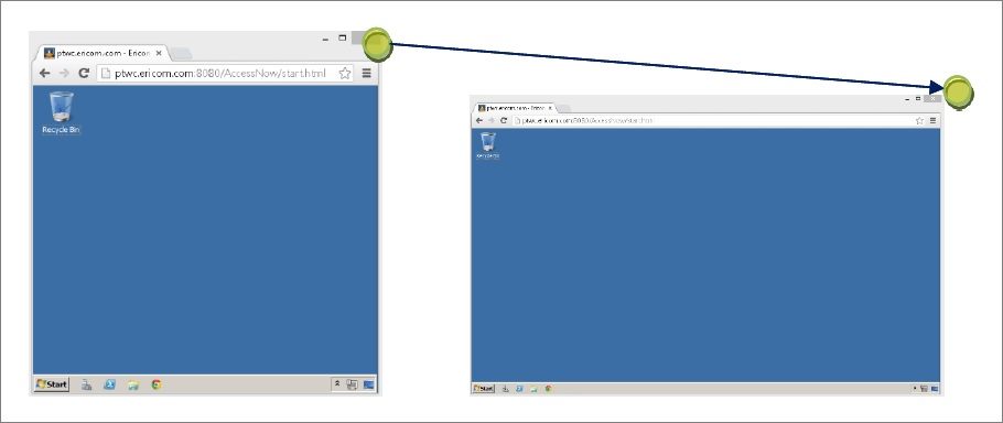 ブラウザのサイズが変更された場合、AccessNow のセッションは新たなサイズに応じて自動的に調整を行います。 ブラウザのウィンドウのサイズを調整するには、ブラウザのウィンドウの角をドラッグして、目的のサイズになった時にマウスを離します。 ブラウザが全画面モードとなっている場合、AccessNow セッションは自動的に全画面で表示されます。