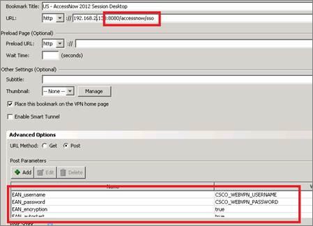 任意の値を AccessNow に渡すには、変数を次のパスに POST します: /accessnow/sso/接頭辞 EAN_Cookie を使用して POST を使用して渡す設定を定義します。 Cisco® ASA SSL VPN で POSTを使用して、ユーザ名、パスワードおよび暗号化設定を渡す例は以下のとおりです: