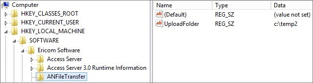 - HKEY_LOCAL_MACHINE\SOFTWARE\Wow6432Node\Ericom Software\ANFileTransfer, REG_SZ value UploadFolder