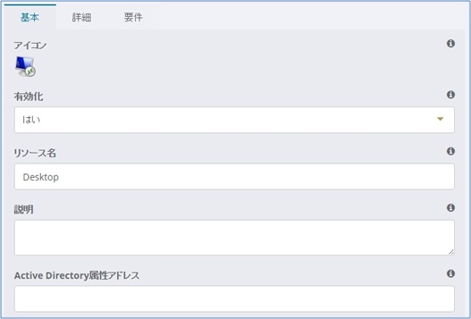 「Active Directory 属性アドレス」でユーザアドレスを含む AD 属性を入力すると、デスクトップ・リソースの宛先アドレスを Active Directory から取得することができます。 この設定を行うには、まずデスクトップ・アドレス(複数可)を含むActive Directory 属性を設定します。