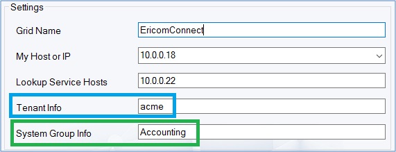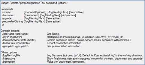 /adminUser <string> []/adminPassword <string> []/tenant <string> [rooturl]/gridName <string> [EricomConnect]/locators <string> [10.0.0.12:4174]/[no]techSupport [False]