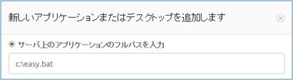 アプリケーションの追加機能を使用して、バッチファイル(.BAT 形式)を公開できます。ファイルを正常に公開するために、そのファイルがいずれかの RDS サーバ上に存在することを確認してください。 「アプリケーション追加」をクリックし、「サーバ上のアプリケーションのフルパスを入力」を選択します。 バッチファイルのパスを入力します。