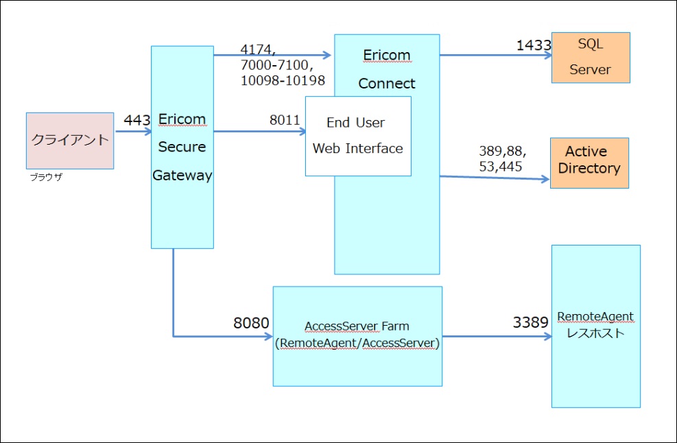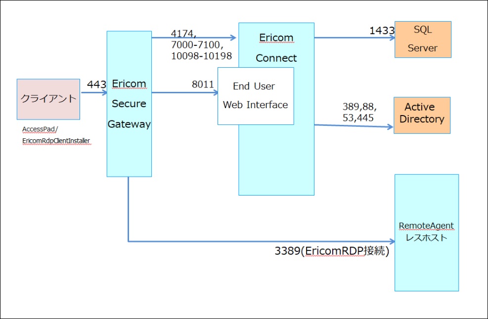 RemoteAgent レス構成時のアクセスフローは、以下の通りです。AccessNow接続の場合は最低1台のAccessServer Farm(RemoteAgent/AccessServer)が必要ですが、EricomRDP接続の場合は不要となります。