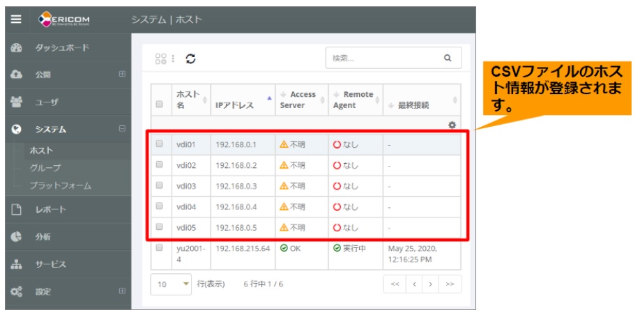 - Host列のデータは、必ずFQDN(完全修飾ドメイン名)で、かつ、DNSによる名前解決ができることを確認してください。名前解決ができていない場合、ConnectサーバへのCSVデータのインポートが失敗します。また、RemoteAgentレスホストへのアクセスはFQDNでDNSへ問い合わせたIPアドレスでアクセスされるため、DNSによる名前解決ができていない場合はRemoteAgentレスホストへアクセスできません。