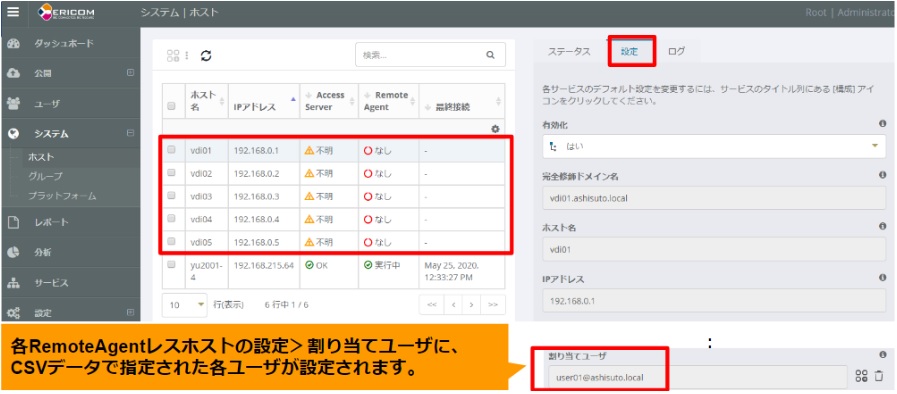 ユーザとホストを紐付けるCSVファイルを作成します。作成するCSVファイルの形式は下記例の通り、UserとHostを列名とします。