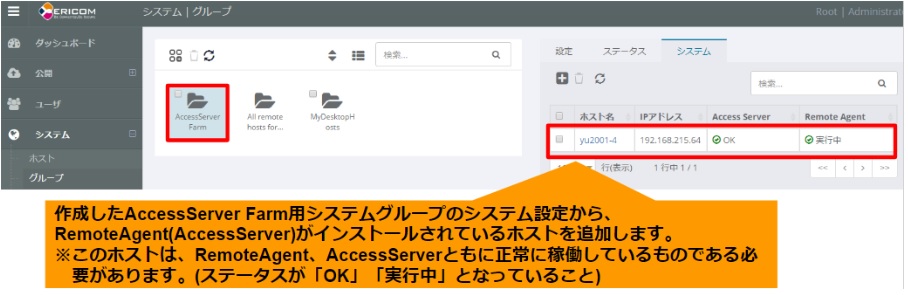 システム>グループ>(AccessServer Farm用システムグループ)>システムの設定から、RemoteAgent(AccessServer)がインストールされているホストを追加します。
