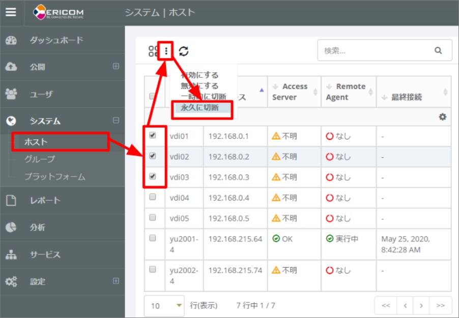 - 削除したいホストにチェックを入れます。