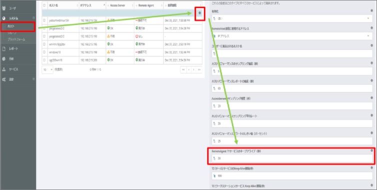 [システム]>[ホスト]>[歯車アイコン]>[RemoteAgent T1サービスのキープアライブ(秒)]