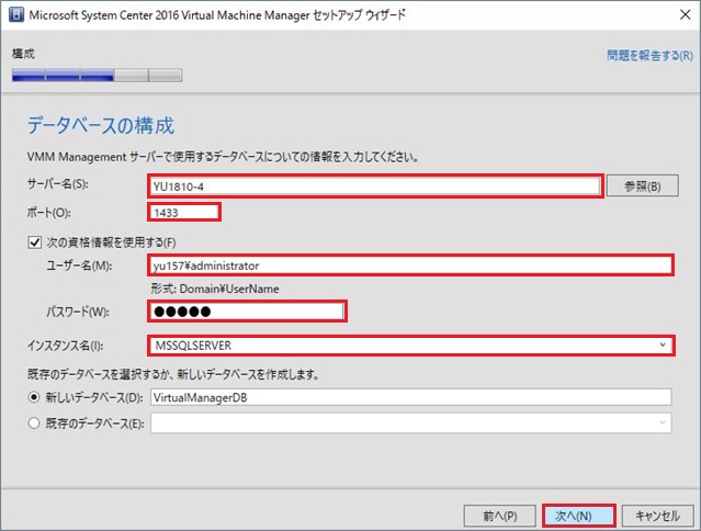1. SCVMM2016が使用するSQL Serverの「サーバ名」「ポート」及び接続する「ユーザ名」「パスワード」「インスタンス名」を入力します。また、新規データベースを作成する場合はチェックを入れてデータベース名を入力します。もしSCVMM2016用に作成した既存のデータベースがある場合は、「既存のデータベース」にチェックを入れてそのデータベース名を入力します。