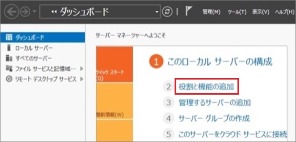 1. Hyper-VをインストールするOSのサーバマネージャーを起動し、[役割と機能の追加]をクリックします。