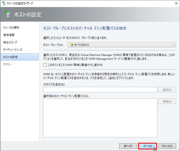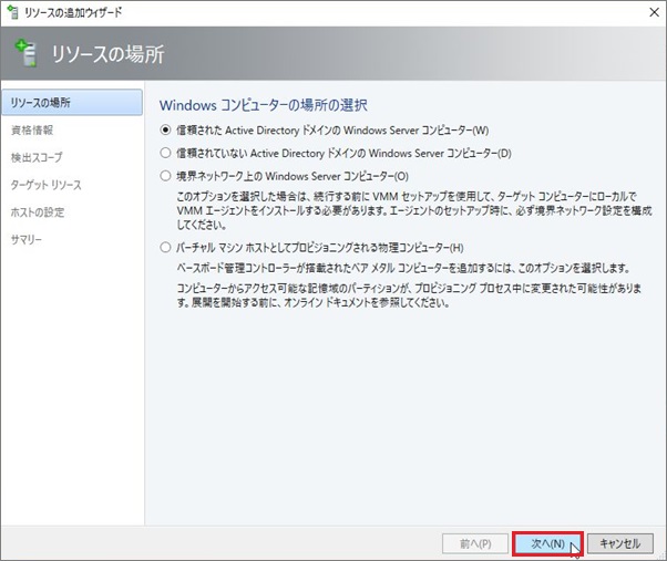 1. これから追加するHyper-Vサーバが所属する場所を選択し、[次へ]進みます。