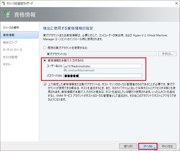 1. VMMサービスで使用するアカウントを入力し、[次へ]進みます。