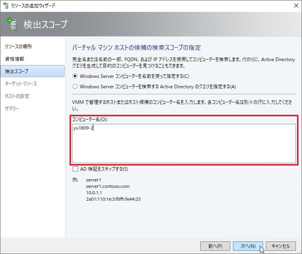 1. Hyper-Vサーバのコンピューター名を入力し、[次へ]進みます。