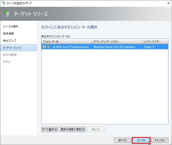 1. 追加するHyper-Vサーバが検出されたことを確認、選択して[次へ]進みます。