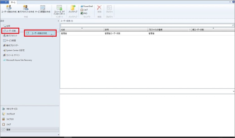 1. SCVMM2016管理コンソールの左メニュー[設定]にある[ユーザ役割]を右クリックし、[ユーザ役割の作成]をクリックします。
