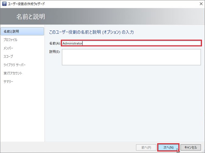 1. [名前]には「Administrator」を入力し、[次へ]進みます。