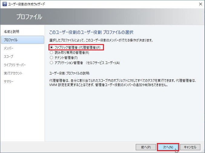 1. [ファブリック管理者]を選択し、[次へ]進みます。