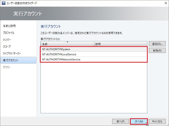 1. System、LocalService、NetworkServiceを追加し、[次へ]進みます。