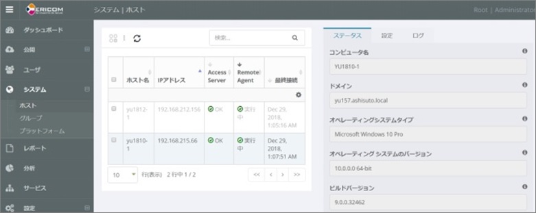 1. Ericom Connect管理コンソールへアクセスし、[システム]>[ホスト]の画面で該当マシンが登録されていることを確認してください。