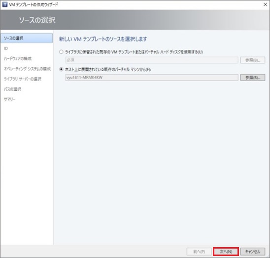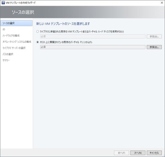 1. 「ライブラリに保管された既存のVMテンプレートまたはバーチャルハードディスクを使用する」もしくは「ホスト上に展開されている既存のバーチャルマシンから」のいずれかにチェックを入れて、[参照]をクリックします。