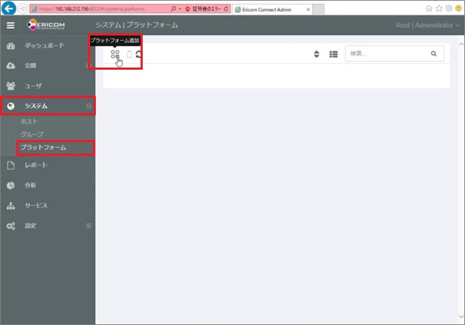 1. 左メニュー[システム] > [プラットフォーム]を選択後、画面上部にある[プラットフォーム追加]をクリックします。