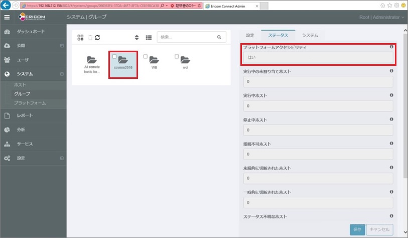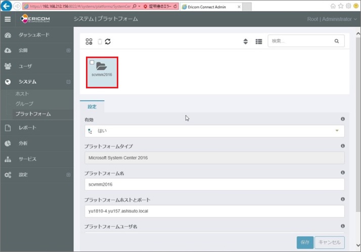 ※「プラットフォームアクセシビリティ」の値が「はい」となっていれば、Ericom ConnectサーバとSCVMM2016は正常に接続できています。この値が「はい」となっていることをご確認ください。