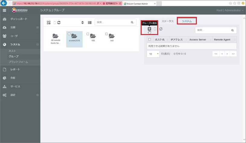 1. SCVMM2016連携用のシステムグループを追加します。左メニューの[システム]>[グループ]を選択後、上部にある「グループに追加」をクリックします。