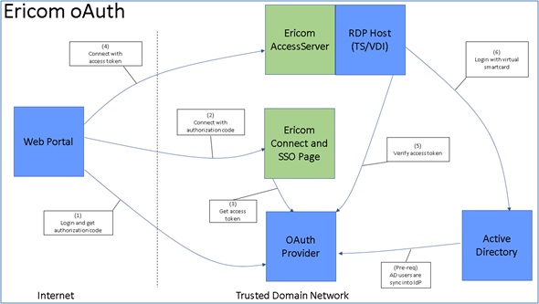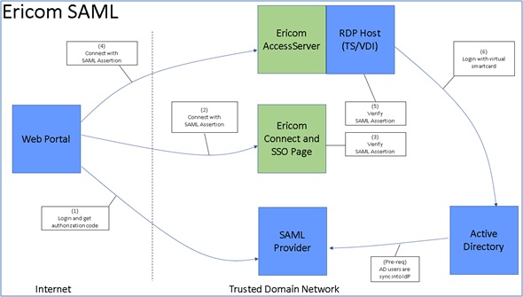 SAML と oAuth の両方を使用して、Web アプリケーション用のシングルサインオン (SSO) を提供できます。 バージョン 9.0 以降、Ericom Connectは、Ericom の HTML5 AccessNow エクスペリエンスを使用して提供される Microsoft リモートデスクトップ・サービスでホストされる Windows アプリケーションへの SAML および oAuth ベースの SSO をサポートします。SAML または oAuth ベースの SSO を使用し統合するには、以下の 3つのユース・ケースがあります: