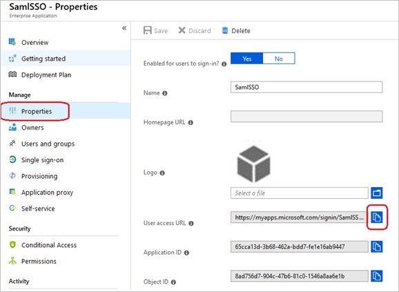 SAML エンドポイント: 「Properties」(プロパティ)タブで、ユーザ・アクセス URL の値をコピーします。この値を使用して、SAML エンドポイントを設定します。