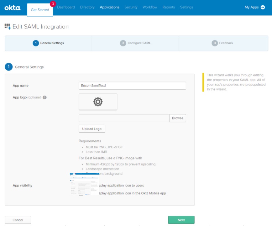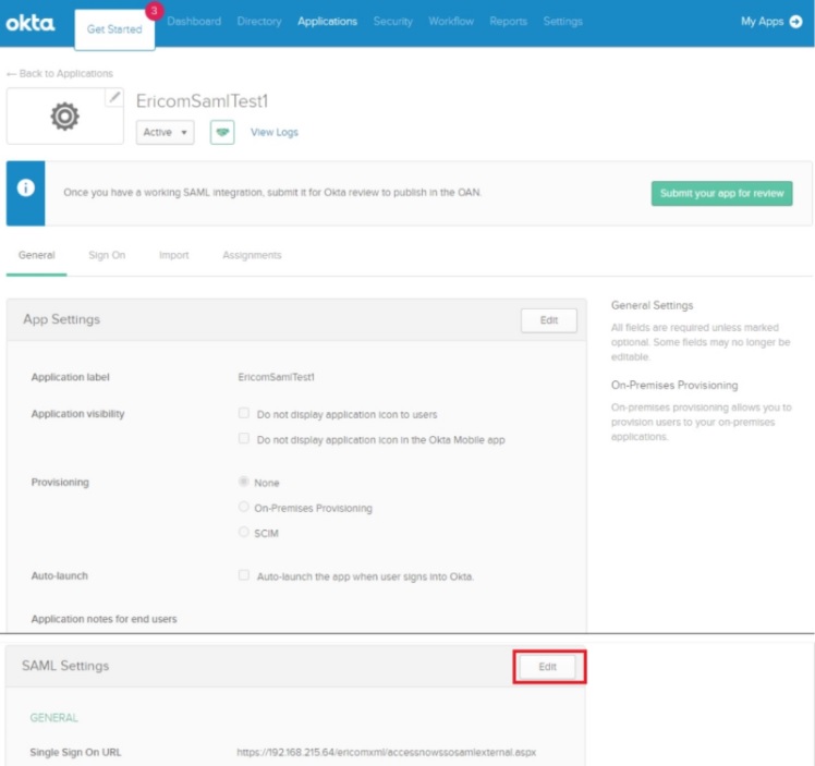 まず、Okta にログインし、SSO 用に作成された Ericom アプリケーションを編集します。「SAML Settings」(SAML設定)の「Edit」(編集)ボタンをクリックします。