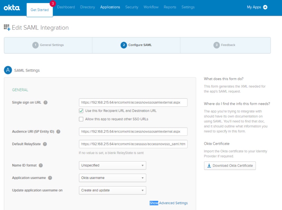 Ericom Connect は、より高いレベルのセキュリティのために暗号化された SAML アサーションをサポートしています。この章では、Okta を使用して、暗号化された SAML アサーションを有効にして設定する方法を説明します。暗号化された SAML アサーションを有効にする前に、SSO 機能が暗号化なしで正しく機能していることを確認してください。