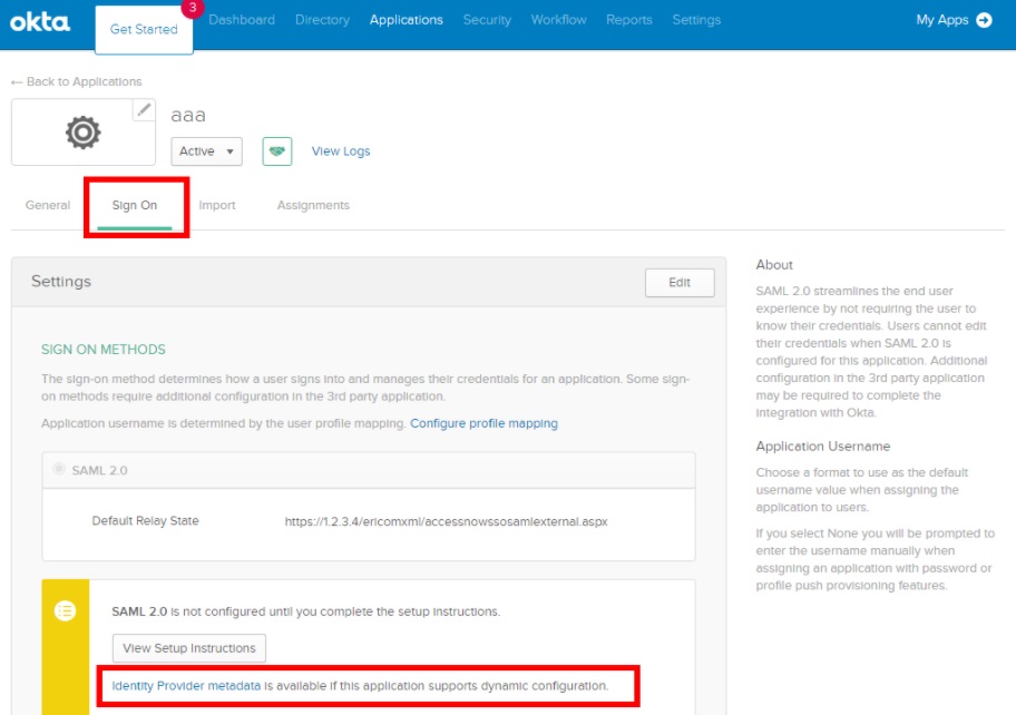 「Sign On」(サイン・オン)タブで、「Identity Provider metadata」(ID プロバイダのメタデータ)リンクを見つけます。