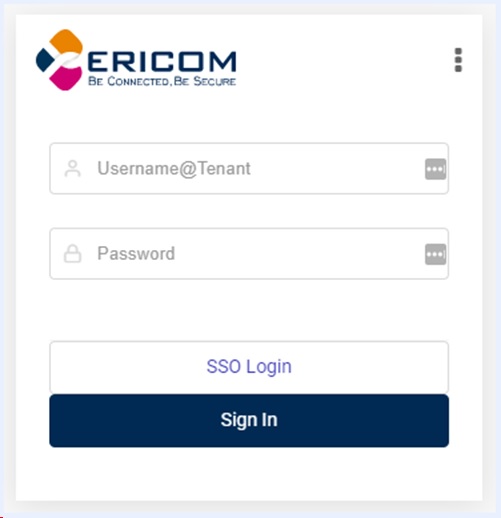 「 Username@Domain 」の入力を行い、「 SSO ログイン 」オプションを選択します (ドメインはフィールド Domain List (ドメインリスト) でテナントごとに定義する必要があります) 。ユーザは、SAML 資格情報を使用して管理コンソールにログインします。