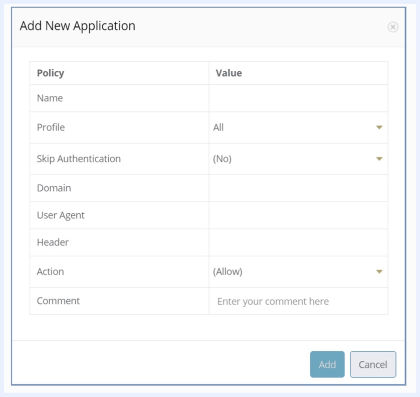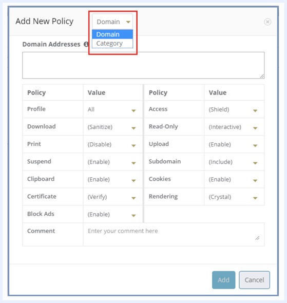 ポリシーテーブルに新しいドメイン/IP アドレス/カテゴリを追加するには、「追加」アイコン(上部バーの左側)を押します。