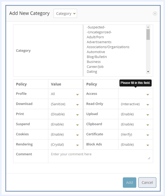 ダイアログが開き、(選択したプロファイルに一致する)現在のポリシーのデフォルト値が適用されます。「カテゴリ名」フィールドにあるドロップダウンリストからカテゴリを選択します。複数選択を使用して (CTRL/Shift キーを使用)、複数のカテゴリを同時に追加できます。必要に応じて(ドロップダウンリストの値を使用して)様々なポリシーを行うか、デフォルトをそのままにします。完了したら、「追加」ボタンをクリックします。