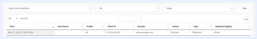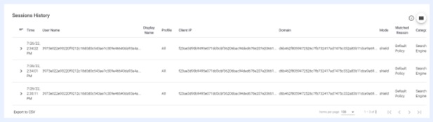 「エクスポート」オプション(上部バーの右側)を選択します。CSV ファイルがローカルにダウンロードされます。このファイルには、管理コンソールのポリシーテーブルと同じ列とエントリが含まれています。ファイル内のすべての値(列名、ポリシー値)は英語表記されます。ドメイン名やコメントが他の言語(日本語など)の場合、CSVファイル形式で出力すると文字が変わる可能性があります。