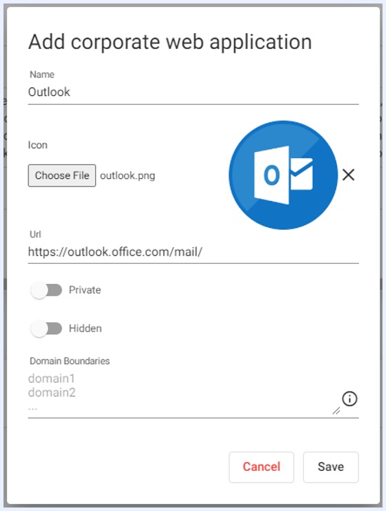 設定 説明 名称 エンドユーザーに表示されるアプリケーションのわかりやすい名前を入力します。 アイコン 「ファイルを選択」をクリックして、アプリケーションのアイコンとして使用する画像を選択します。 URL WAIサービスからアクセス可能なWebアプリケーションのURLを入力します。 プライベート Webアプリケーションにアクセスする際に、Web分離サービスと企業のデータセンター間でIPsec接続を行う場合は、この設定を有効にします。 非表示 WAIポータルでアプリケーションを非表示にするには、この設定を有効にします。 ドメイン境界 アプリケーションで使用する追加のドメインを入力します。これらのドメインは、隔離コンテナ内に留まります。 保存 設定を保存し、コンフィギュレーションダイアログを終了します。 キャンセル 変更をキャンセルし、コンフィギュレーションダイアログを終了します。