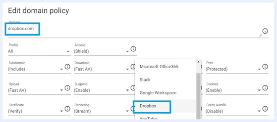 コントロールヘッダーを有効にするには、SaaSアプリケーションのポリシーを作成し、適切なコントロールヘッダーを選択します。 この例では、Dropbox を選択して、ユーザーが dropbox.com を参照したときにコントロール ヘッダーを有効にします。